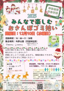 『おさんぽゴミ拾い』in与野公園(12/10)開催案内 2025.11.26 与野公園は紅葉真っ盛り。段々と寒さが厳しくなってきましたが、今年最後のゴミ拾いを開催します。 参加される皆さんにはホカロンをプレゼント。背中を温めながらみんなで街を綺麗にしましょう。 ≪ 前へ お知らせ一覧へ戻る 次へ ≫