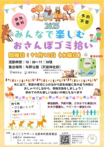 『おさんぽゴミ拾い』in与野公園(11/12)開催案内 2025.10.30 ハロウィンイベントも終わり、与野公園は木々の紅葉が楽しみな季節となりました。 昼間日差しの暖かい時間に、ゴミ拾いやおしゃべりを致しましょう。 ≪ 前へ お知らせ一覧へ戻る 次へ ≫