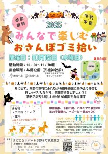 『おさんぽゴミ拾い』in与野公園(10/15)開催案内 2025.09.30 来月の『おさんぽゴミ拾い』は、第3週の開催となります。 その頃には暑さももう少し落ち着くことと思います。 年々短くなっていく秋の風を楽しみましょう。 まごころ10月版 (A4) – 1 ≪ 前へ お知らせ一覧へ戻る 次へ ≫
